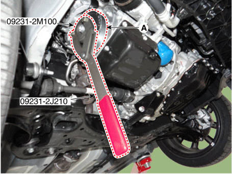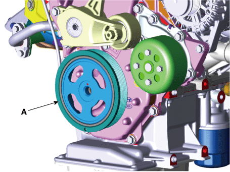 С помощью SST (09231-2M100, 09231-2J210) удерживайте шкив демпфера коленчатого вала (A).