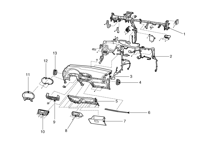 9. Центральная панель в сборе 10. Аудиоблок в сборе 11. Верхняя панель приборной панели в сборе. 12. Комбинация приборов в сборе 13. Боковой вентиляционный канал в сборе [LH] |