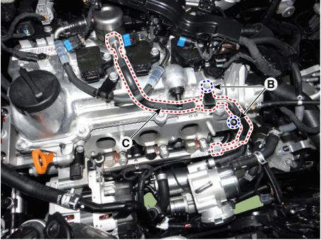 Отверните болты крепления (В) и снимите топливную магистраль высокого давления (С).