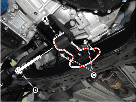 Снимите болты крепления коробки передач (А).