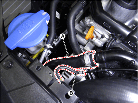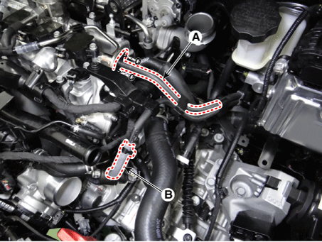 Отсоедините топливный шланг (А) и шланг (В) электромагнитного клапана управления продувкой (PCSV).