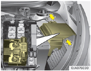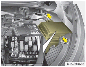 После проверки панели предохранителей в моторный отсек, надежно установить крышку панели предохранителей через звуковой звук щелчка. В противном случае могут возникнуть электрические сбои. от контакта с водой.