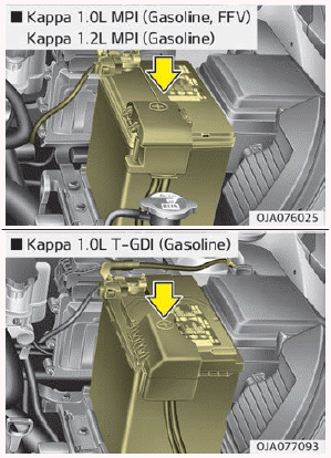 В основном оборудованная батарея является обслуживанием свободный тип. Если ваш автомобиль оснащен батареей с маркировкой с НИЖНИМ и ВЕРХНИМ сбоку, можно проверить уровень электролита. Уровень электролита должен быть между НИЖНЯЯ и ВЕРХНЯЯ. Если уровень электролита низкий, необходимо добавить дистиллированную (деминерализованную) воду (Никогда не добавляйте серную кислоту или другие электролит). При заправке будьте осторожны не забрызгивать аккумулятор и прилегающие компоненты. И не переполняй аккумуляторные батареи. Это может вызвать коррозию на других частях. После этого убедитесь, что крышки ячеек затянуты. Контакт профессиональная мастерская. Киа рекомендует посетить авторизованный Дилер/сервисный партнер Киа.