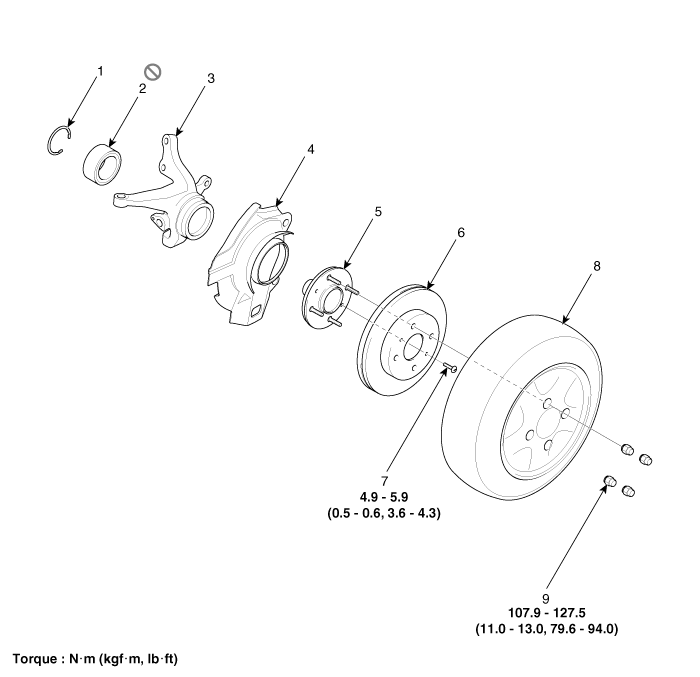 7. Винт крепления тормозного диска 8. Колесо/шина 9. Колесная гайка |