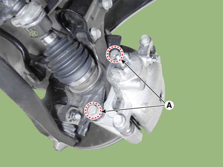 Выверните болты крепления тормозного суппорта (А) и удерживайте тормозной суппорт проволокой.