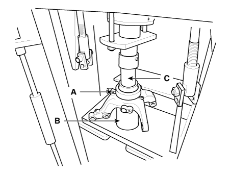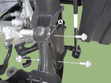 Ослабьте болты и гайки передней стойки и снимите узел поворотного кулака (А).