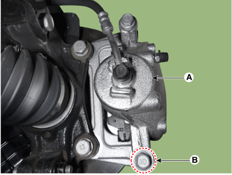 Ослабьте болт направляющего стержня (В) и затем поверните корпус суппорта (А) вверх, чтобы он не мешал.