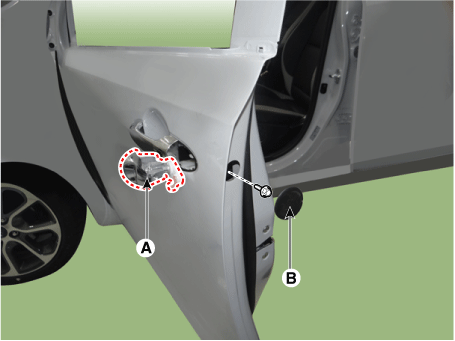 Снимите заглушку отверстия (B), затем ослабьте болт и снимите дверной замок в сборе (A).