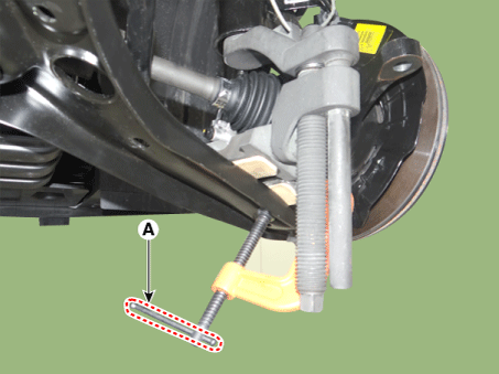 Медленно затяните основной болт корпуса (А) и снимите нижний рычаг с переднего поворотного кулака.