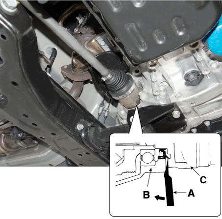 Вставлять монтировку (A) между картером коробки передач (B) и картером шарнира (C), и отделите приводной вал (А) от картера коробки передач.