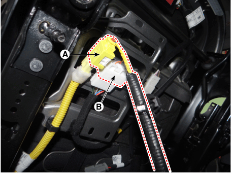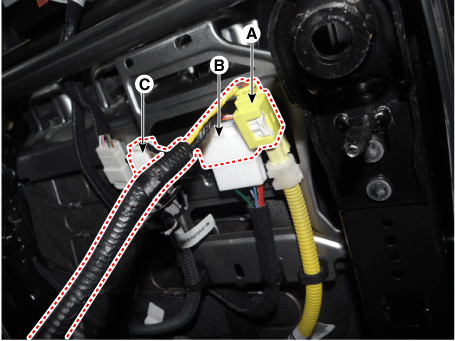 Отсоедините разъем подушки безопасности (А), разъем обогревателя сиденья (В), разъем замка переднего ремня безопасности (С).