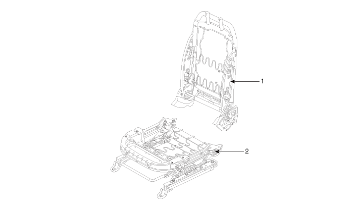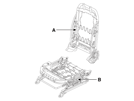 Ослабив крепежные болты, отсоедините раму спинки переднего сиденья в сборе (А) и раму подушки переднего сиденья в сборе (В).
