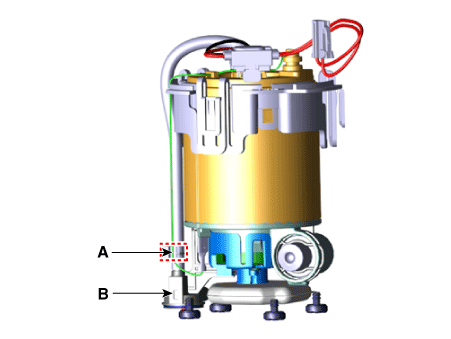 Отсоедините разъем электродвигателя топливного насоса (А) и разъем датчика уровня топлива (В).