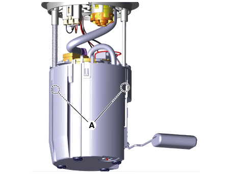 Нажмите на фиксирующий крюк (А) отверткой и снимите датчик уровня топлива в направлении стрелки.