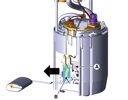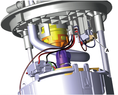Процедуры ремонта Удаление 1. Снимите топливный насос. (См. Система подачи топлива — «Топливный насос») 2. Отсоедините разъем электродвигателя топливного насоса (A) и разъем датчика уровня топлива (B). ...