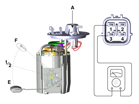 С помощью омметра измерьте сопротивление между контактами 1 и 3 разъема датчика (А) на каждом уровне поплавка.