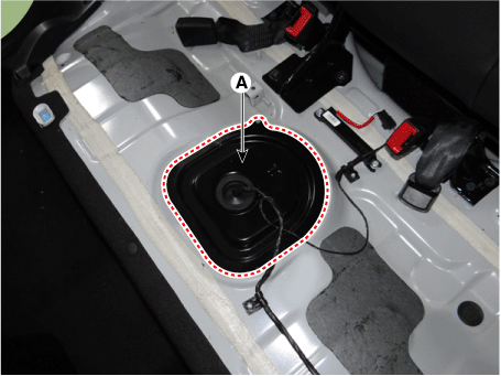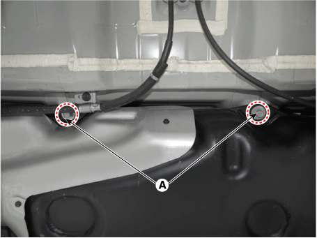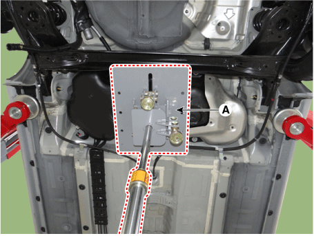 Поднимите автомобиль и поддержите топливный бак домкратом (А).