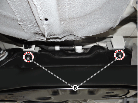 Снимите болт крепления топливного бака (А) и гайку (В).