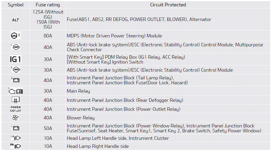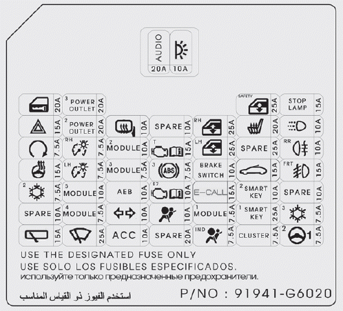 Внутри крышек панели предохранителей/реле вы можно найти этикетку предохранителя/реле, описывающую имя и мощность предохранителя/реле.