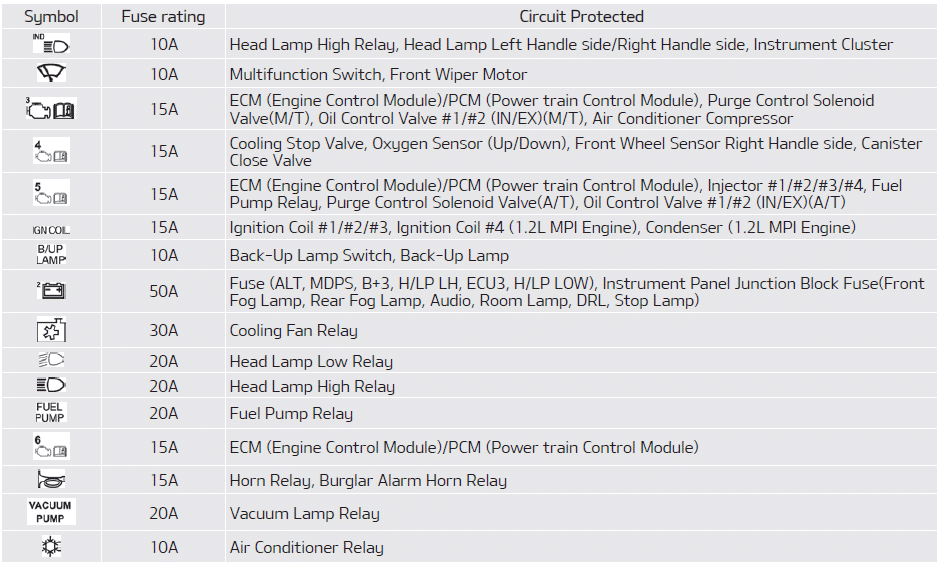 Панель предохранителей моторного отсека (Двигатель Kappa 1,0 л/1,2 л MPI (бензин))
