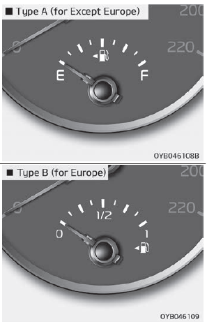 Закончившееся топливо может подвергнуть транспортное средство опасности жильцов к опасности. Вы должны остановиться и получить дополнительные топливо как можно скорее после загорается сигнальная лампа или когда манометр приближается к отметке Уровень «0 или E (пусто)».