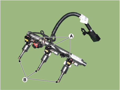 Поместите направляющую для установки уплотнения (B) (SST №: 09353-2B000) на наконечник форсунки, не повредив наконечник форсунки (A).