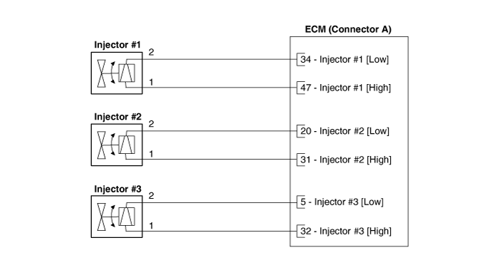 стороне) для подачи напряжения на форсунки и цепи массы (низкий