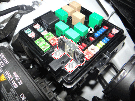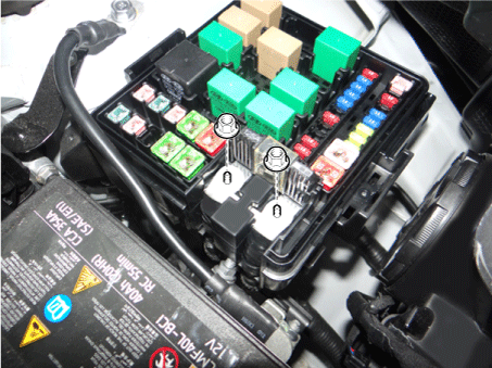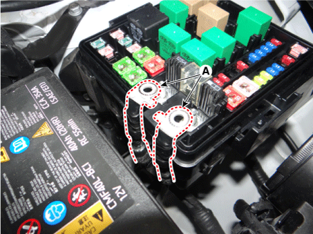 Снимите клеммы силового кабеля (A) после ослабления гаек на блоке предохранителей и реле моторного отсека.