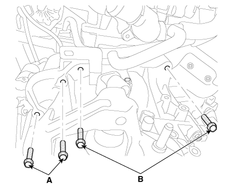 Ослабьте болты крепления стартера (А) и болты крепления коробки передач (В).
