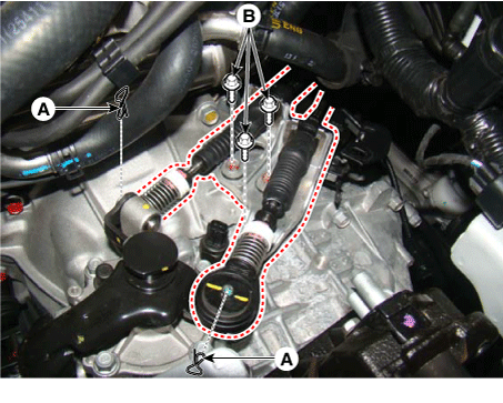 Снимите узел цилиндра выключения сцепления (В), открутив болты (А).