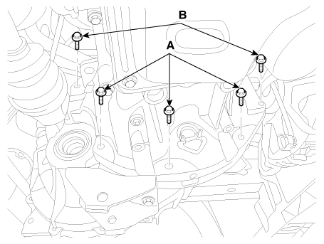 Ослабьте нижние болты крепления коробки передач (А, В).