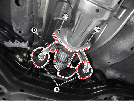 Снимите каталитический нейтрализатор и центральный глушитель в сборе (В).