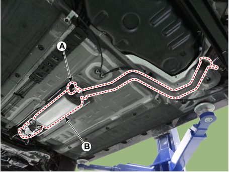 Отсоедините резиновую подвеску (А) от каталитического нейтрализатора и центрального глушителя в сборе.