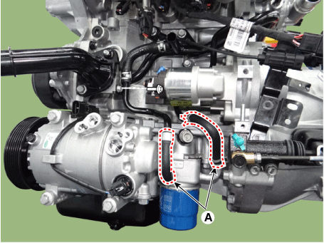 Подсоедините шланги охлаждающей жидкости масляного радиатора (А).