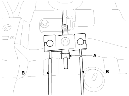 Установите трос стояночного тормоза (В) и держатель троса (А).