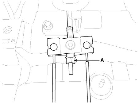Установите регулятор троса стояночного тормоза, затем отрегулируйте ход рычага стояночного тормоза, поворачивая регулировочную гайку (А).