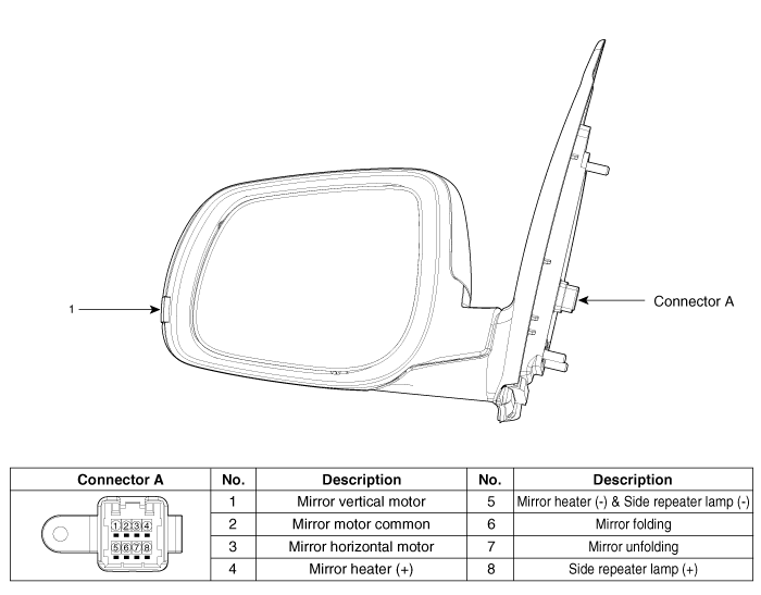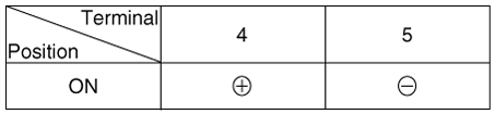 Подайте напряжение батареи на каждую клемму, как показано в таблице, и убедитесь, что зеркало работает правильно.