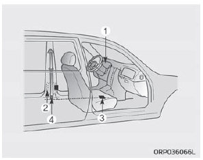 Система преднатяжения ремней безопасности состоит в основном из следующих компонентов. Их расположение показано на иллюстрация: