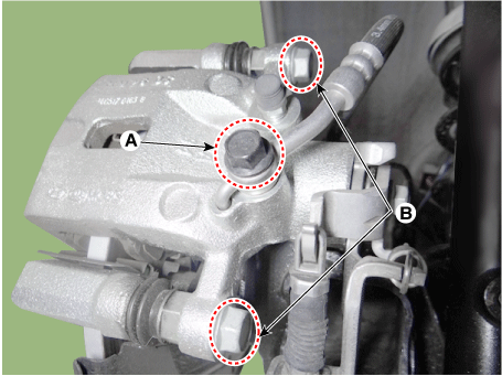 Ослабьте рым-болт (А) и направляющие болты (В), затем снимите корпус суппорта.
