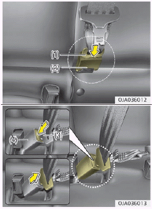 Механизм фиксации центрального поясного ремня отличается от таковых для плечевые ремни заднего сиденья. При креплении плечевые ремни заднего сиденья или центральный поясной ремень, убедитесь, что они вставлены в правильную пряжки для максимальной защиты от системы ремней безопасности и обеспечить правильную работу.