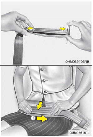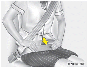 Вы должны поместить часть поясного ремня максимально низко и плотно на бедрах, а не на талии. Если поясной ремень расположен слишком высоко на талии, это может увеличить вероятность травмы в случае столкновения. Оба руки не должны быть ни под, ни над Ремень. Скорее, нужно закончить а другой под, как показано на иллюстрация.