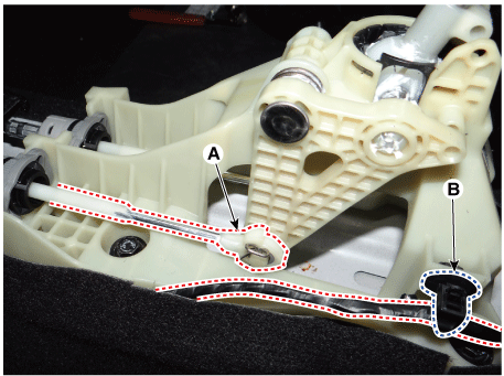 Снимите фиксатор проводки (В) с рычага переключения передач.