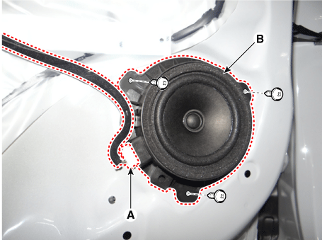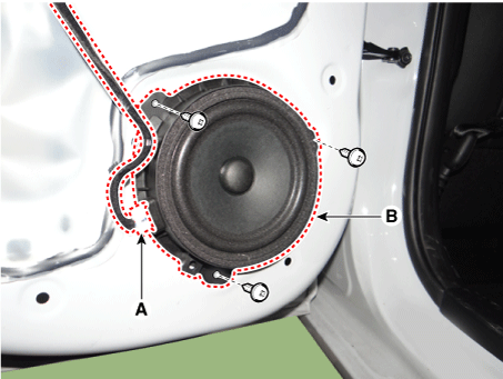 Снимите динамик передней двери (B), отсоединив разъем (A) и ослабив винты.