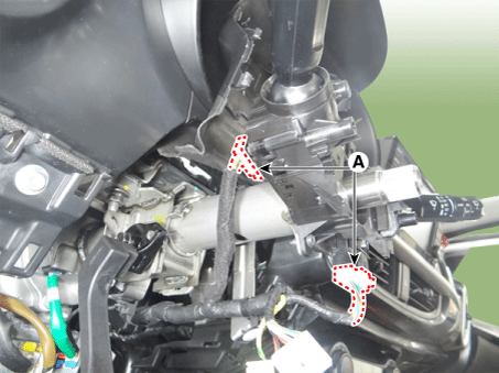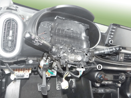 Снимите болт замка рулевого колеса (А) и разъем часовой пружины (В) с рулевого колеса.