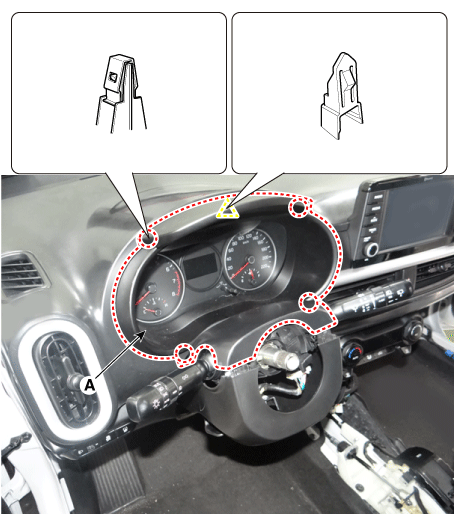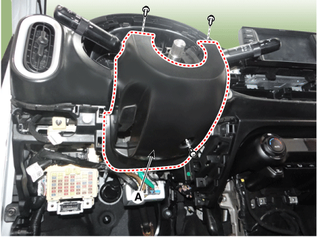 Снимите нижнюю панель кожуха рулевой колонки (А) после ослабления крепежных винтов.