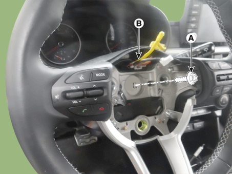 Ослабьте болт блокировки рулевого управления (А) и отсоедините разъем часовой пружины (В).