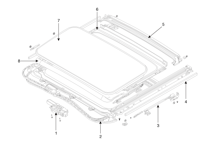 6. Солнцезащитный козырек люка в сборе 7. Стеклянная панель люка в сборе 8. Дефлектор люка в сборе |