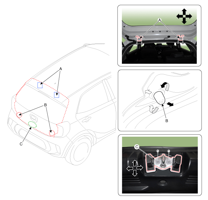 ослабив болты крепления фиксатора двери багажного отделения (C), отрегулируйте дверь багажного отделения