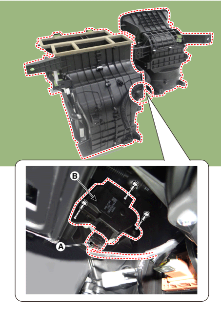 Отсоедините разъем (А), а затем снимите привод регулирования температуры (В), предварительно ослабив крепежные винты.