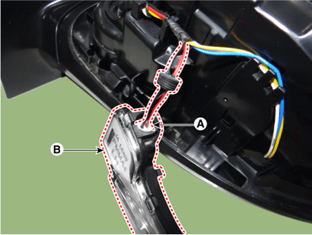 Отсоедините разъем (А) от лампы указателя поворота наружного зеркала заднего вида (В).